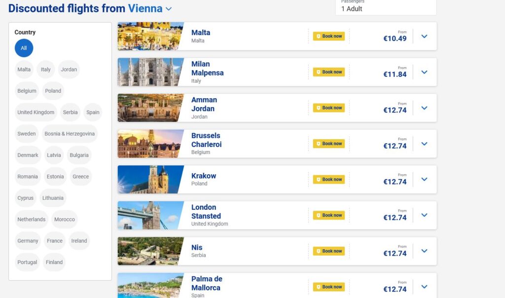 Lowcost kompanija Ryanair ima odličnu akciju danas i nude 15% za sve letove iz zračnih luka poput Beča ili Zagreba. Iz Beča se putuje na vrhunske destinacije po cijeni od 10, 11, 12 ili 14 eura. Popis putovanja i cijene provjerite na linku ispod. Pogledajte i screenshot ispod za popis destinacija (dio destinacija). Iz Beča se sa Ryanairom leti na više od 50 destinacija.